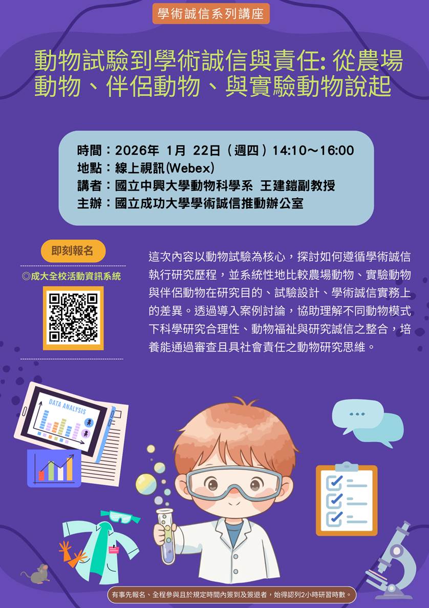 成功大學學術誠信推動辦公室特別邀請 國立中興大學動物科學系 王建鎧副教授,帶領我們從農場動物、伴侶動物到實驗動物的不同維度,深入探討研究者應負擔的社會責任與誠信準則。誠摯邀請您報名參與!